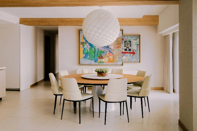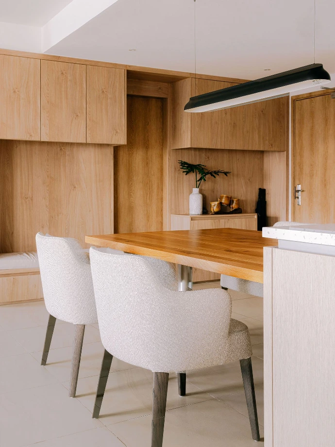 A serene fusion of Scandinavian and Japanese aesthetics, Hjem Sora embodies a tranquil, airy retreat within its 300 sqm. Named after the Norwegian "hjem" (home) and the Japanese "sora" (sky), this combined unit in Pasig City captures a boundless sense of home as an open, light-filled sanctuary. Japanese wabi-sabi rawness meets Scandinavian hygge coziness, with thoughtfully selected materials adding warmth and depth. Subtle pops of color bring energy to a calming, neutral palette, creating a harmonious balance of texture, tone, and design.