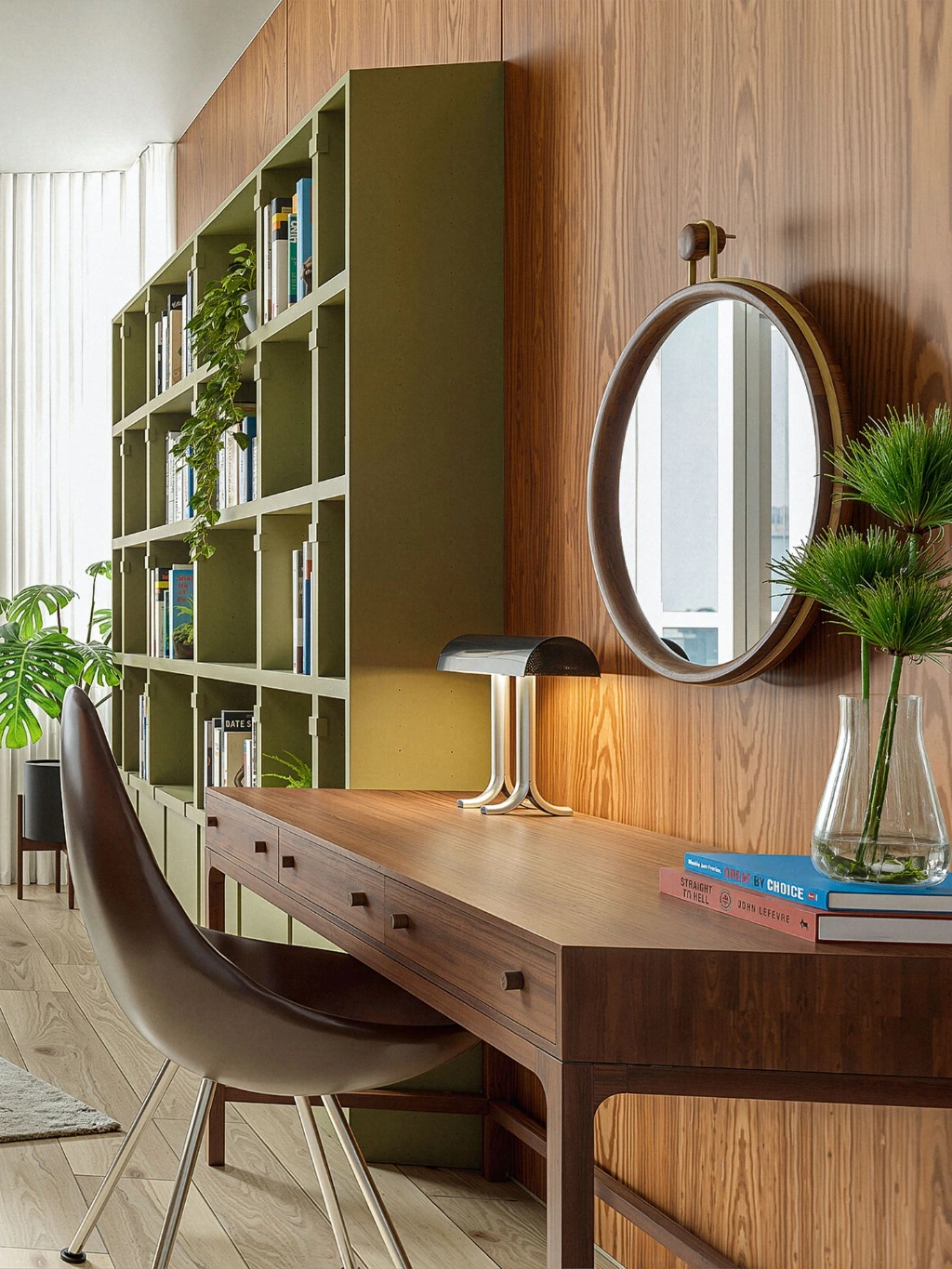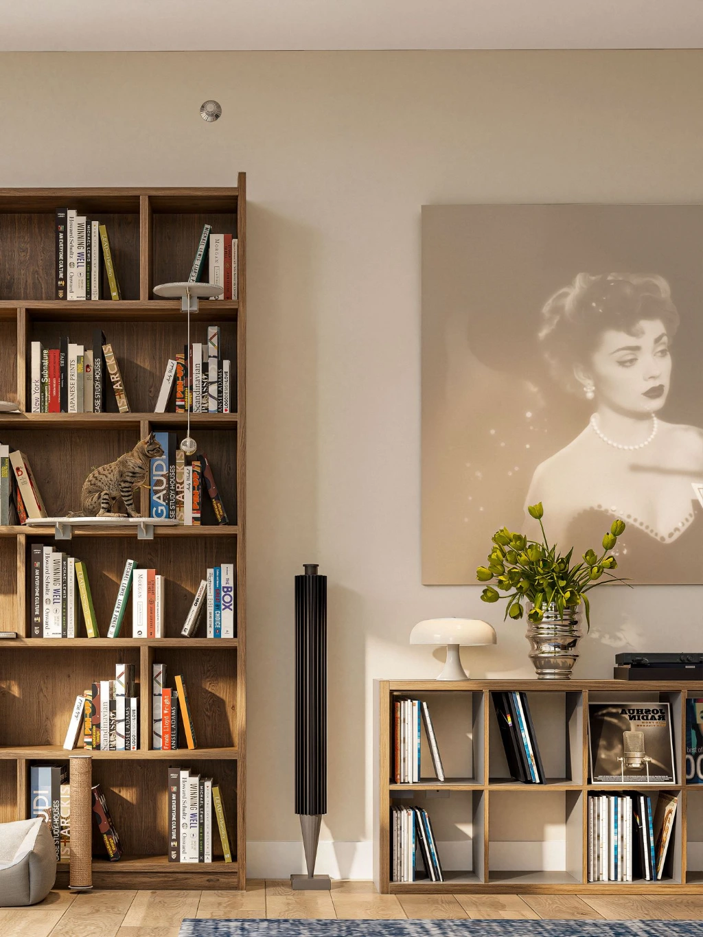 surfaces, illuminating curated pieces and warming the space. This modern mid-century