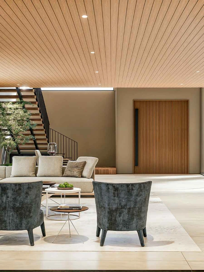 Modern Contemporary with neutral schemes and a deep pop of color. Textures of stone, bricks, travertine and lacquer,. Anthracite metal framing accents in furniture and exterior elements. Modern, straightforward and clean lines, Refined yet modern furniture, Cement textures and bold variety of artwork.