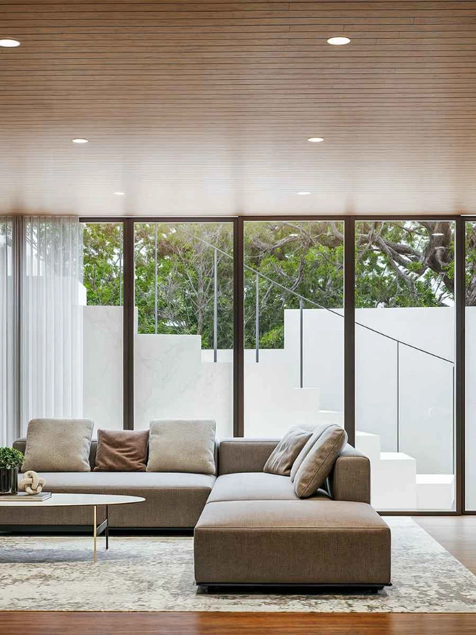 bricks, travertine and lacquer,. Anthracite metal framing accents in furniture and exterior