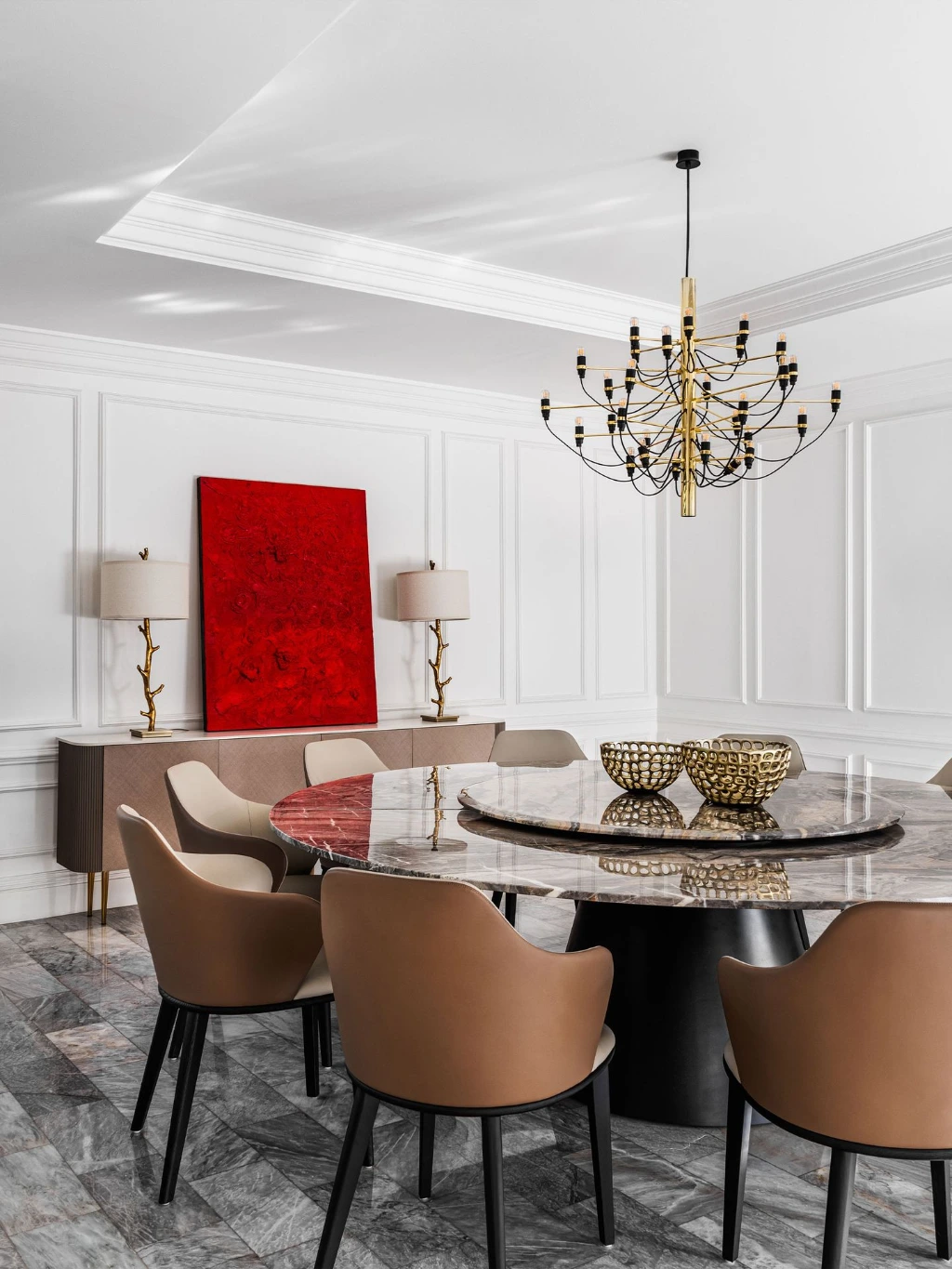 Set in a tranquil Katipunan village, our newly completed project is a refined take on transitional design, where 1970s heritage meets modern sophistication. Restored French doors open to a veranda framed by marble balustrades, while original paneling and intricate ceilings honor the past. A curated mix of wavy glass and brass tables, sculptural accents, and plush swivel chairs creates a dialogue between eras. In the foyer, sapphire marble, bold stone flooring, and subtle brass inlays add depth and quiet luxury. A palette of black, taupe, and beige unifies the home, striking a balance between classic elegance and contemporary edge.