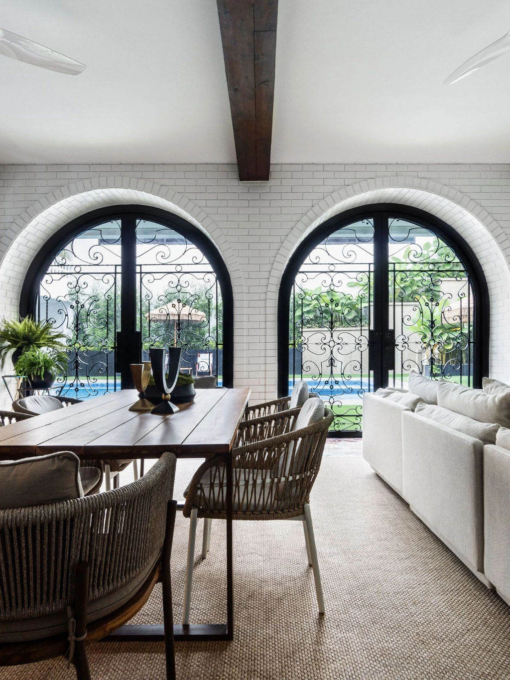Set in a tranquil Katipunan village, the home is a refined expression of transitional design, where heritage and modern sophistication are carefully balanced. Rooted in timeless elegance, the design preserves original elements such as French doors, intricate ceilings, and paneling, allowing the home’s 1970s character to remain present while being thoughtfully reinterpreted. Bright and airy spaces are enhanced through soft lighting, warm textures, and a cohesive palette of black, taupe, and beige, creating a calm yet elevated atmosphere. Modern practicality is seamlessly integrated through curated, ergonomic furnishings that support comfort without compromising refinement, while classical elements are reintroduced through sculptural accents, wavy glass, and brass details that add depth and character. From the marble balustraded veranda to the foyer’s rich materiality of sapphire marble and bold stone flooring, each space is shaped with intention, resulting in a home that feels layered, elegant, and quietly contemporary.