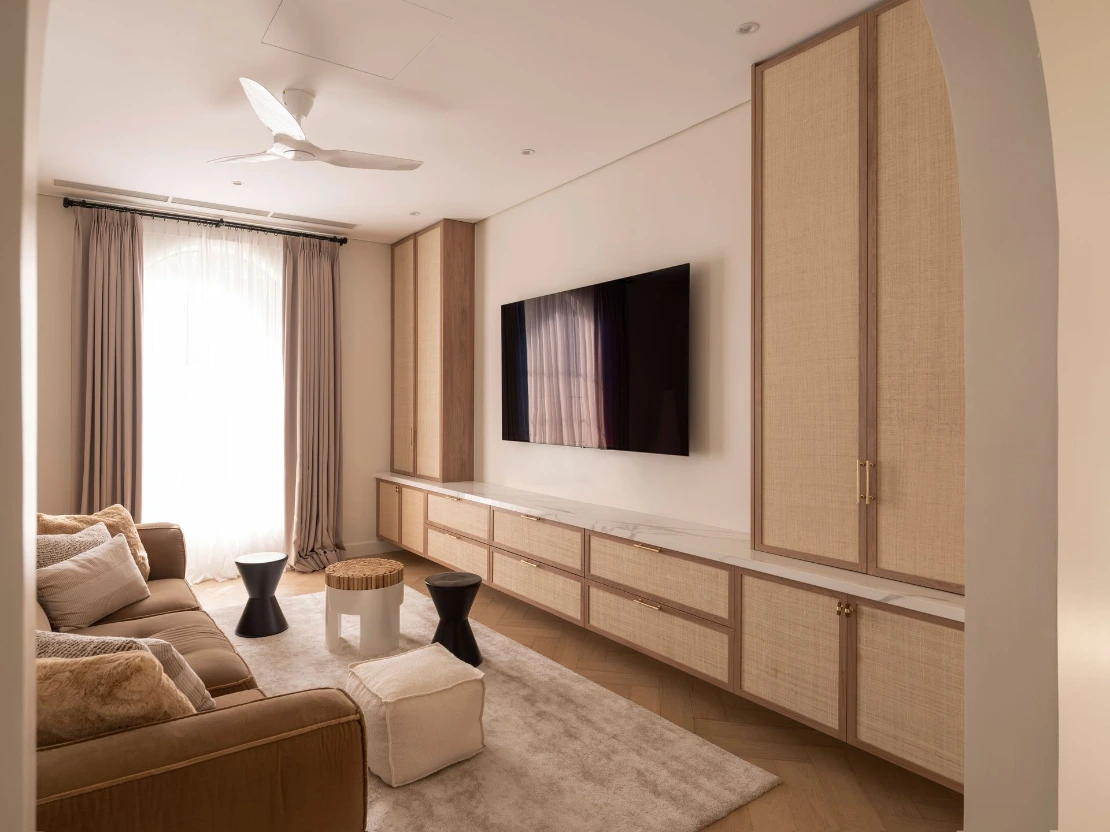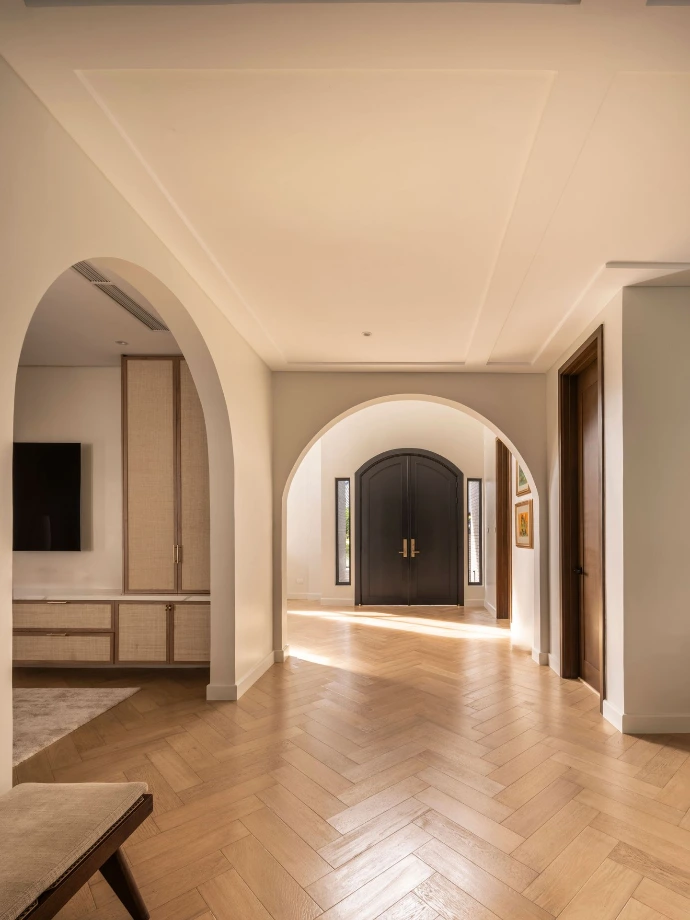 In this Ayala Alabang family home, timeless design is reimagined for modern living. Bright, open spaces flow seamlessly, defined by clean, transitional architecture. Black wrought iron accents, arched windows and doorways, and textured shiplap walls introduce a sense of crafted detail. A layered lighting scheme, from subtle cove lighting to focused task lights, creates a warm, inviting ambiance, showcasing a curated collection of furniture. The interplay of cozy canvas upholstery, sleek metal details, and warm wood furnishings strikes a balance between comfort and sophisticated style.